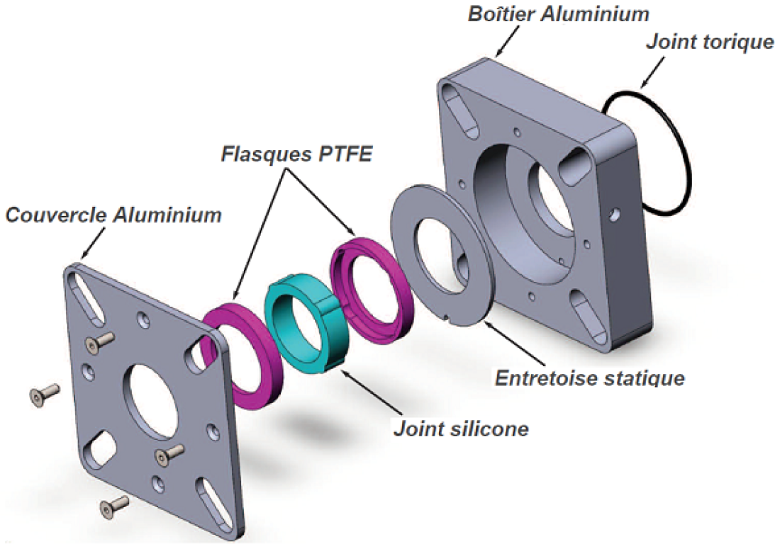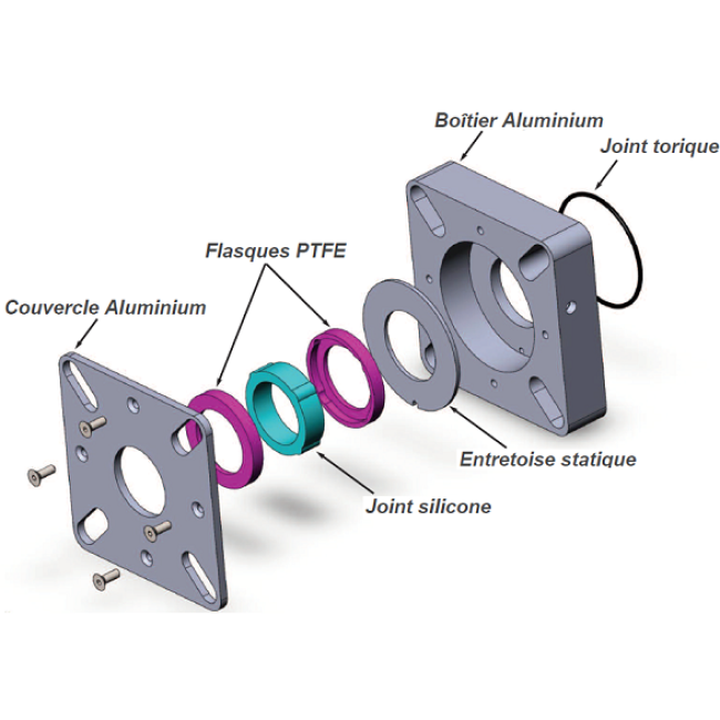 Les flasques en PTFE compressent le joint, et assurent l'étanchéité entre le boîtier et le système d'étanchéité.