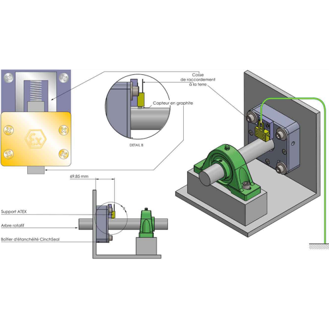 Ce capteur en graphite capte l'électricité statique qui peut être générée par le joint rotatif CinchSeal. Monté sur ressort, cela lui permet de rester en contact permanent avec l'arbre, même en cas de balourd lié à sa rotation.